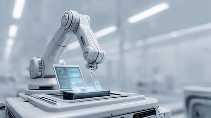 Quality Control - Minimal Tech Concept: minimalistic concept art of automated quality control system, single robotic scanner arm, digital display interface