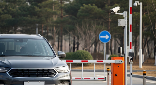 Gray suv at a security checkpoint with a camera and barrier gate in a controlled access area on a sunny day ensuring safety and monitoring vehicles