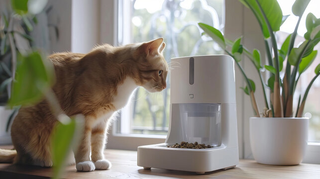 A curious cat observes modern automatic pet feeder placed on wooden table near window, surrounded by lush green plants. scene captures serene moment of pet care and companionship