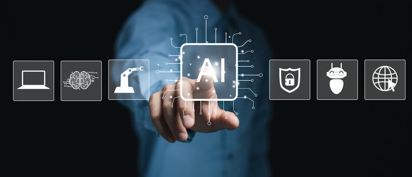AI searching management tools, development technology assistance service support concept. AI chat bot icon in magnifying glass lens with many gears cogwheels on blue network background with space.