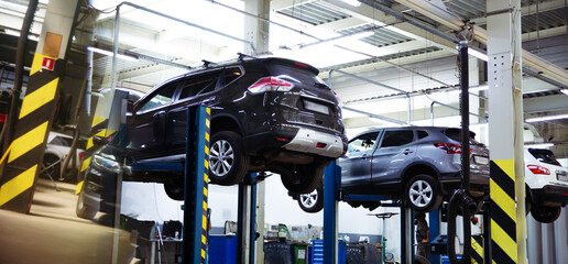 Modern car repair station with a large number of lifts and specialized equipment for diagnostics and service repair car