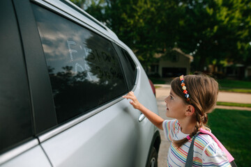 child writes on car window