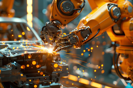 Selective focus of 3D rendering of a robot arm welding a car frame in a car assembly plant.