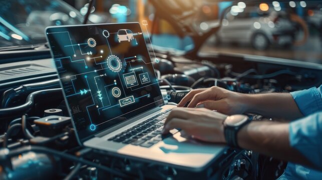 close-up of hands car mechanic using a laptop checking up on car engine parts for fixing and repair, automotive industry, Smart service diagnostics software concept.