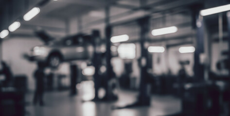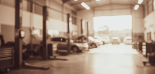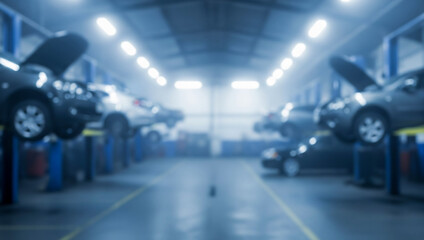 Car repair shop interior with vehicles and equipment blurred background.