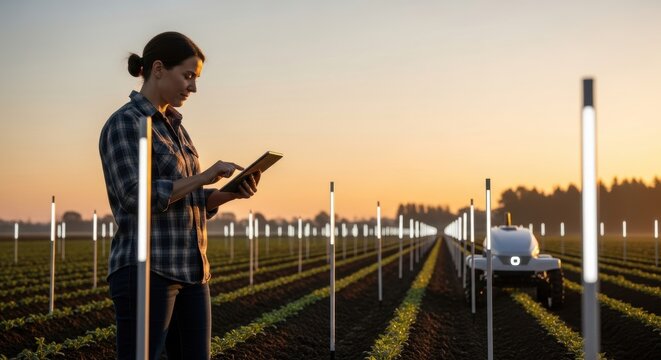 An autonomous farming robot analyzing soil quality, a vast agricultural field with precision irrigation systems, High-tech style