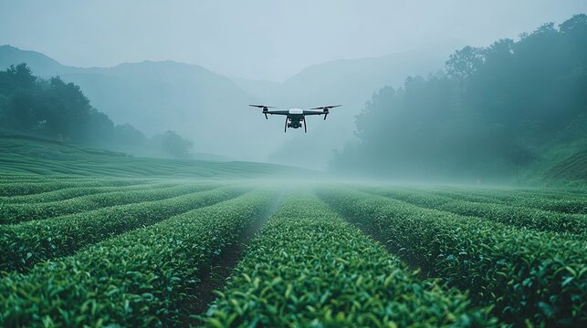 A farming drone hovering above lush tea plantations to distribute fertilizer, demonstrating the Smart Farm 4.0 concept.