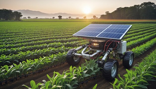 Automated agriculture: A robot harvests a field of crops, showcasing the future of farming with sustainable and efficient agricultural practices.