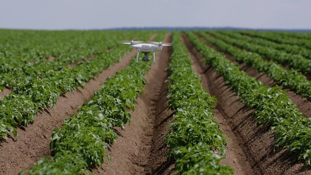 Flying Smart Agriculture Drone. Artificial Intelligence. Drone Scan Agriculture Farm. Agriculture Innovation. Farming Field Industry. Analyze the Field. Professional Vehicle Aircraft