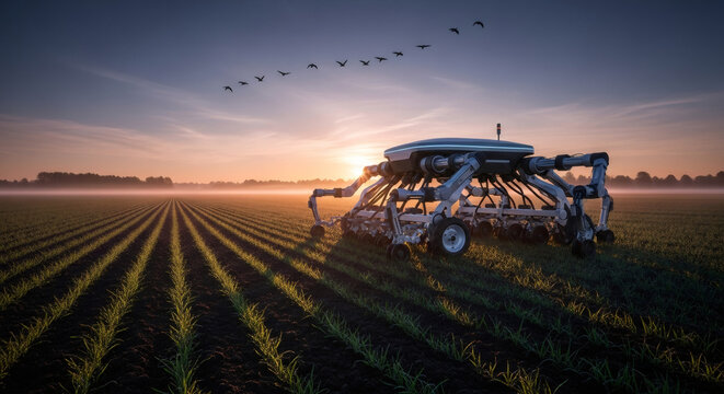 Automated farming robot in a field at sunrise. Modern agriculture, future ai technology harvest concept. Precision farm equipment.