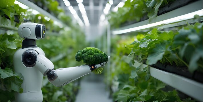 humanoid robot android farmer helps grow plants, vegetable garden of the future, futuristic food growing technology, agriculture development