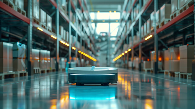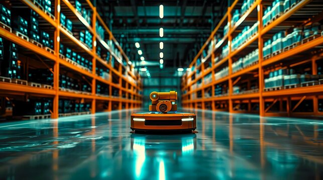 A smart autonomous robot navigates through an expansive warehouse aisle, representing the cutting edge of logistics with efficient and precise goods management.