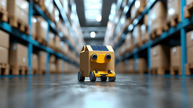 A small yellow robot with solar panels navigates a warehouse aisle lined with boxes on shelves.