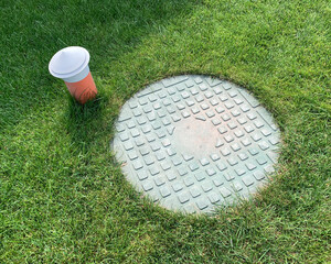 Green plastic septic tank manhole and vent pipe on the lawn near the house.