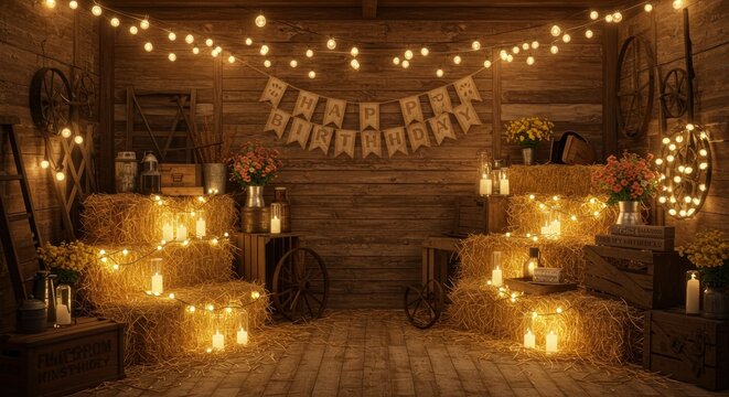 Rustic birthday celebration backdrop with hay bales and warm glowing string lights scenery
