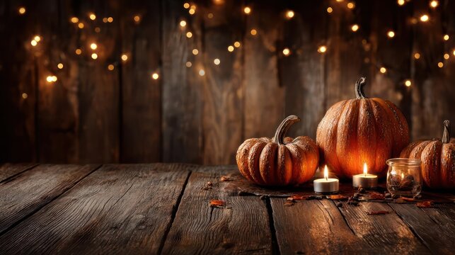 Cozy autumn evening scene with pumpkins candles and warm bokeh lights on rustic wooden background