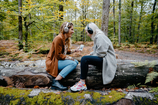 Two Women streaming a Video on a Smartphone in a remote forest