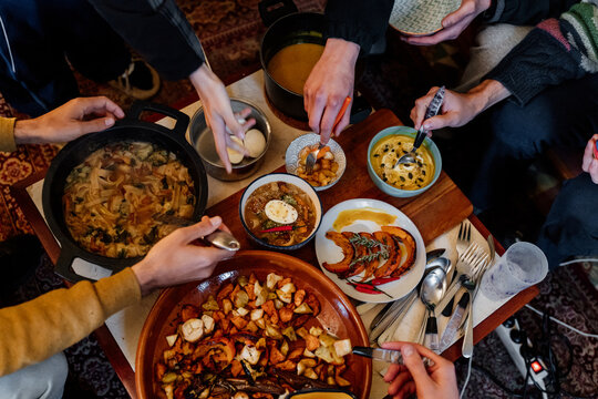 High angle view at diverse group of friends enjoying homemade food at festive dinner table with roasted turkey or chicken, copy space