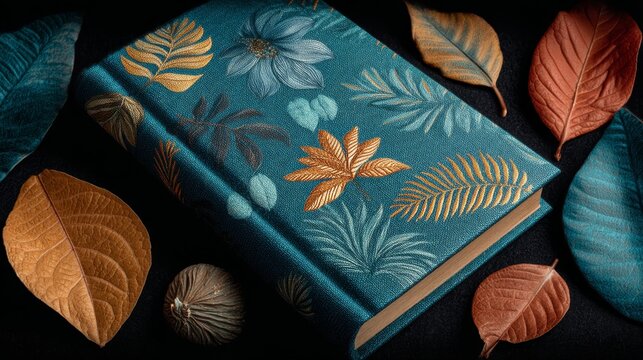 Decorative floral book with autumn leaves on dark background, elegant and vintage style.