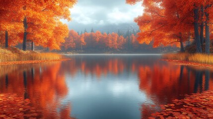 Tranquil lakeside cabin amidst autumnal foliage landscape