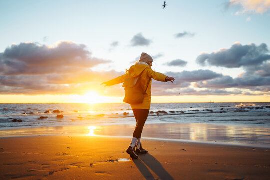 Pretty female traveler walks on shore near tranquil sea at sunser. Nature paradise
