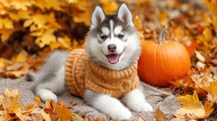 A charming husky puppy in a warm orange sweater smiles amidst a vibrant autumn landscape of fallen leaves and a bright pumpkin.