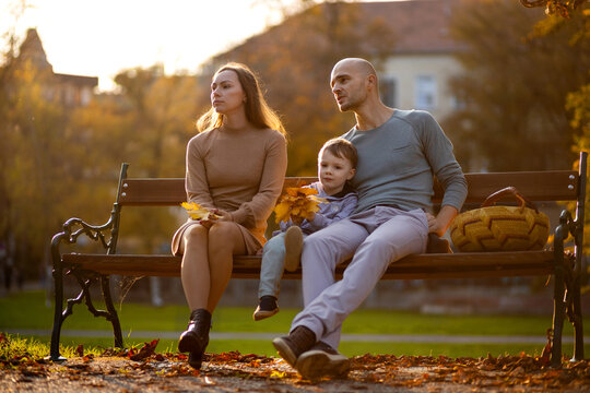 Happy family father mother and child son has fun on a walk in the autumn leaf fall in park