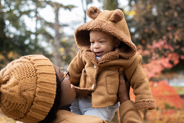 father throws his son child up into the sky dressed in red knitted hats in autumn