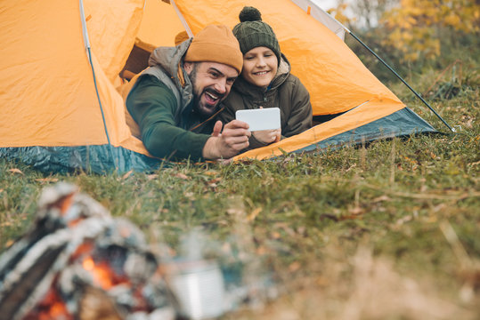 Family lisure concept image. Father and son drink a tea sitting in touristic tent
