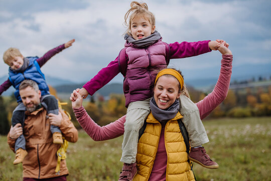 Happy family in autumn park. Generative AI