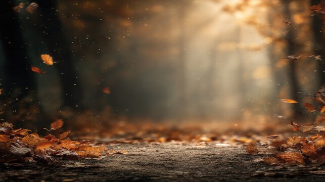 Ground level view captures forest path covered in dry, swirling autumn foliage with sunbeams filtering through the trees