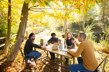 African american friends arranging sunflower and rose centerpiece at autumn dinner table