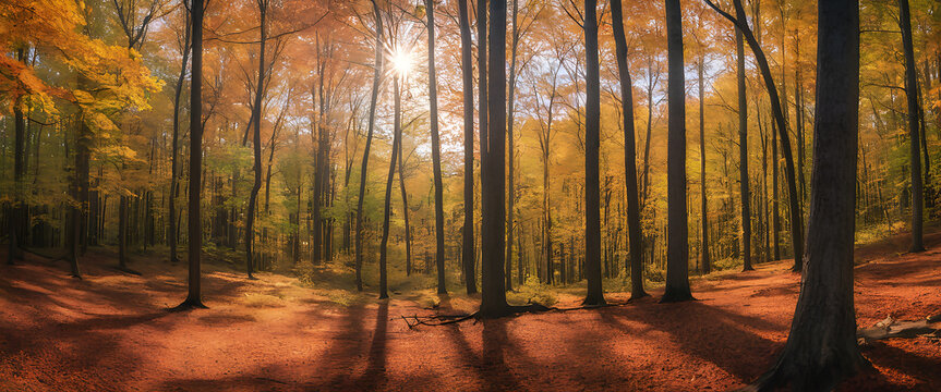 Panoramic view of sunlit autumn woods with vibrant red leaf carpet