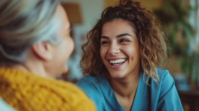 A home health care worker assists an elderly woman in her home A home health care worker assists an elderly woman in her home / Healthcare aide / Medical assistant