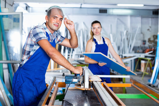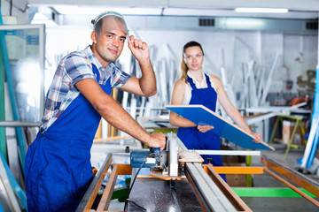 Warehouse worker checking inventory with tablet and manual pallet jack