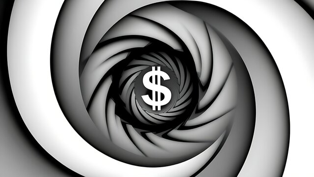 cynicism. A distorted spiral pattern featuring a currency symbol at its center in monochromatic graphic design style. pitch deck slides.