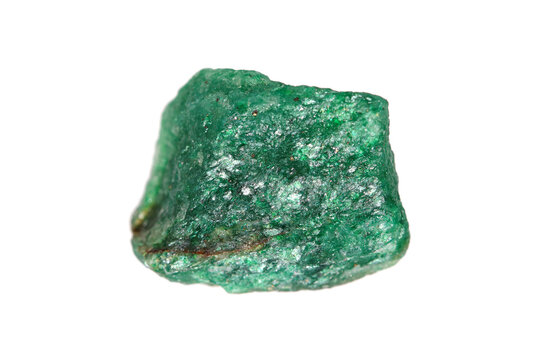 Closeup natural rough green Aventurine gemstone with an optical reflectance effect (aventurescence) on white background (shallow dof)