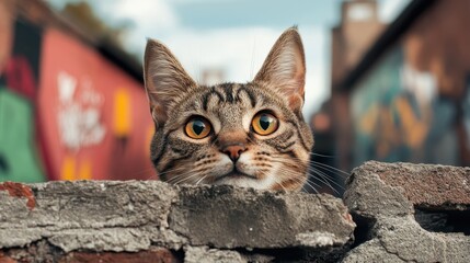 A curious tabby cat with striking yellow eyes looks out from behind a rustic brick wall set against a slightly blurred urban backdrop, creating a playful scene.