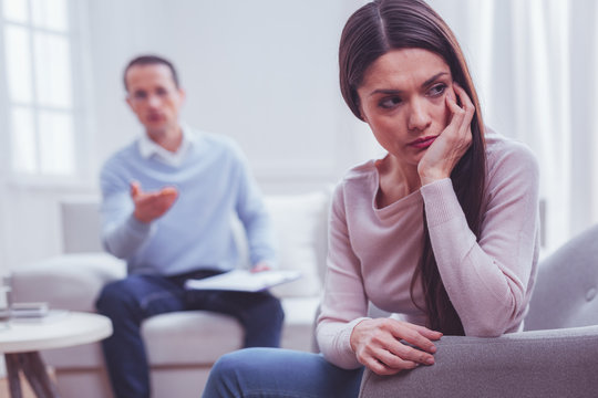 Unsuccessful advice. Portrait of disappointed young good looking woman averting her glance and propping her head on hand while having psychological appointment