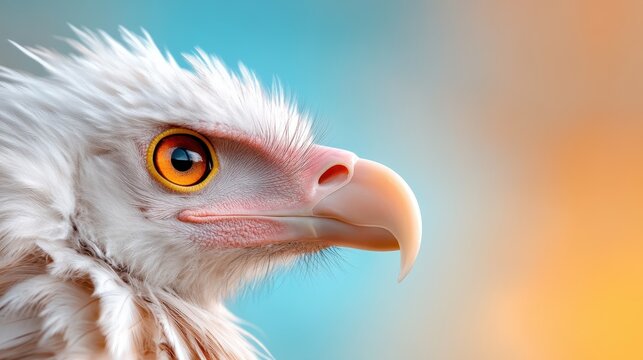 A close-up portrait of a bird showcasing its vibrant plumage, particularly its striking orange eye and sharp beak set against an elegantly blurred background.