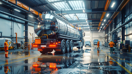 An oil tanker truck parked in a maintenance garage with engineers working around it