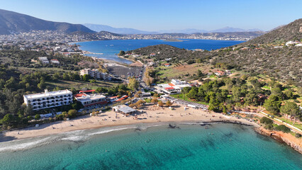 Aerial panoramic view of the beautiful bay of Avlaki at Porto Rafti, Attica, Greece, with turquoise sea and sand beaches