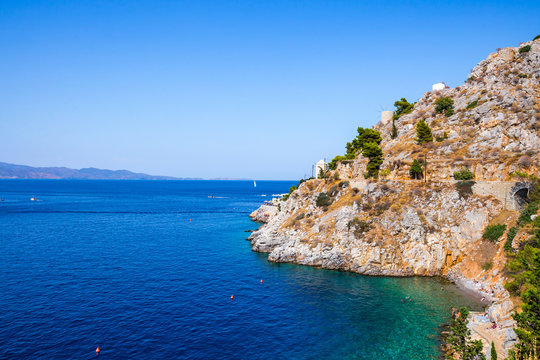 Beautiful Greek landscape of Avlaki beach on Hydra with tourists floating in the sea. Hydra is one of the Saronic Islands of Greece.