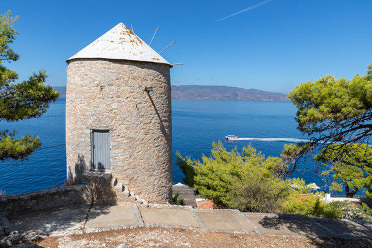 Beautiful view on old wind mill and sea on island Hydra, Greece on sunset time.