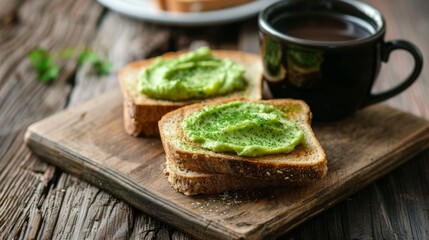 Avocado bread toast sandwich with coffee. Morning breakfast background.