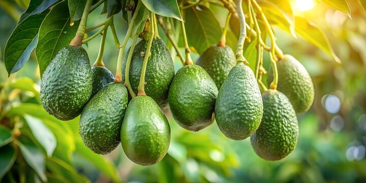 Lush avocado fruits hanging from a tree branch, bathed in sunlight, showcasing the vibrant green hues and healthy abundance of natures bounty