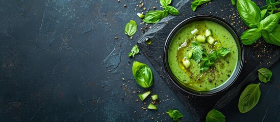 Cucumber Gazpacho Green fresh cold summer soup Top view. Creative Banner. Copyspace image
