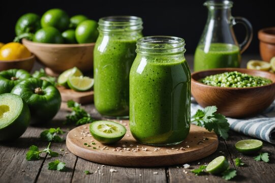 Bowl with green gazpacho and ingredients on color background