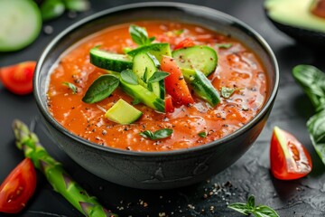 Close up of gazpacho with avocado and tomatoes in bowl