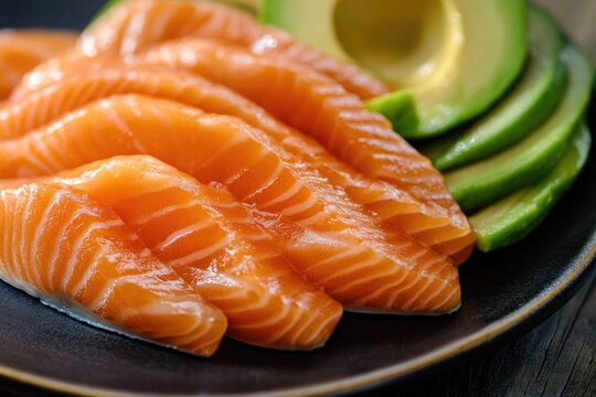 Fresh salmon and avocado slices on a plate, perfect for a healthy snack or appetizer